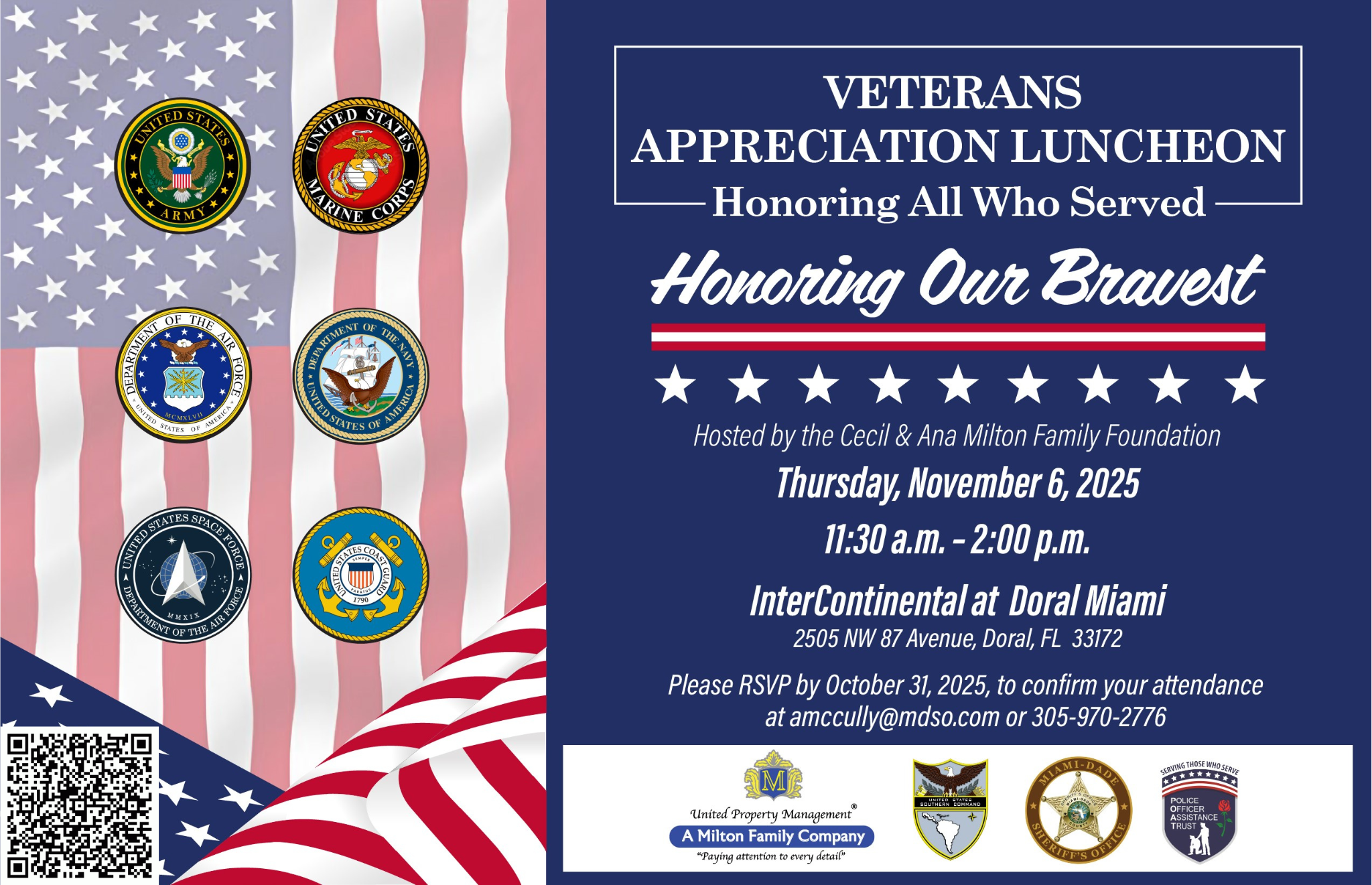 Hosted by the Cecil & Ana Milton Family Foundation along with the POAT at the InterContinental Hotel at Doral. Please RSVP by October 31, 2025, to Annette McCully at amccully@mdso.com or 305-970-2776.